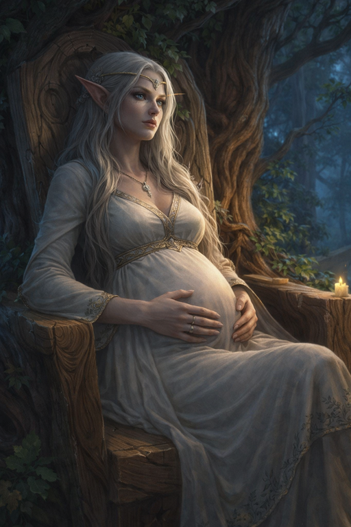 Han hade varit snabb nog in i kammaren att Elbereth inte var inne förrän han väl satt sig och omgående backade några av de närmast dörren undan. Hon bar en lång klänning i mjuk vit ton, enkel i snittet men tydligt av hög kvalitet. Tyget föll avslappnat över hennes kropp och var skräddarsytt för hennes graviditet. Längs ärm och nederkant löpte ett diskret broderi i dämpad skogsgrön tråd. Över hennes panna vilade ett smalt diadem i lätt metall, och runt halsen bar hon ett enkelt halsband som vilade strax ovan bröstet, medan en signetring prydde hennes hand. Hennes silverblonda hår var löst fallande över axlarna, det var länge sedan hon lät det flätas.